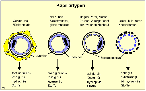 Gehirn dar. Die Kapillaren im Gehirn sind durch ihren Aufbau für hydrophile Stoffe nahezu