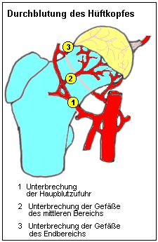 - Ist die Hauptblutzufuhr durchbrochen oder behindert, so kann der gesamte Hüftkopf von