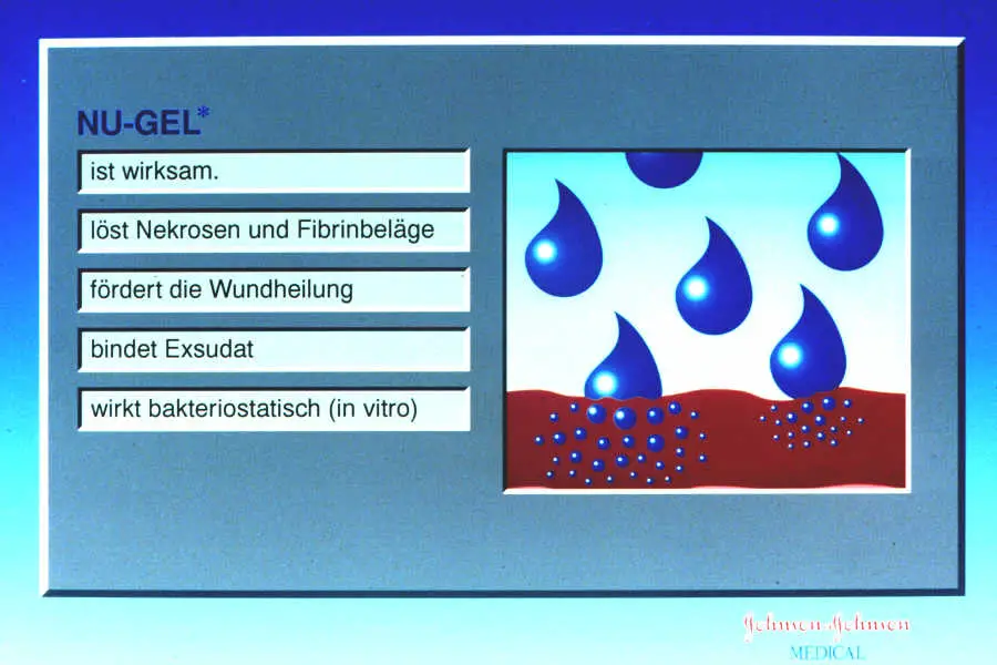 NU-GEL bewirkt die Rehydratisierung trockenen Gewebes. Auf diese Weise werden Nekrosen und Fibrinbeläge, die eine Wundheilung behindern, auf sanfte Art gelöst. Diese sogenannte autolytische Form des Debridements erweist sich als vorteilhaft: im Gegensatz zum enzymatischen Debridement wird der vorgeschädigte Organismus nicht noch zusätzlich mit Wirkstoffen belastet, die im Falle der Enzyme sehr nebenwirkungsreich sein können. Zudem ist die Wirkung eines enzymatischen Debridements im Bereich trockener Nekrosen stark herabgesetzt.