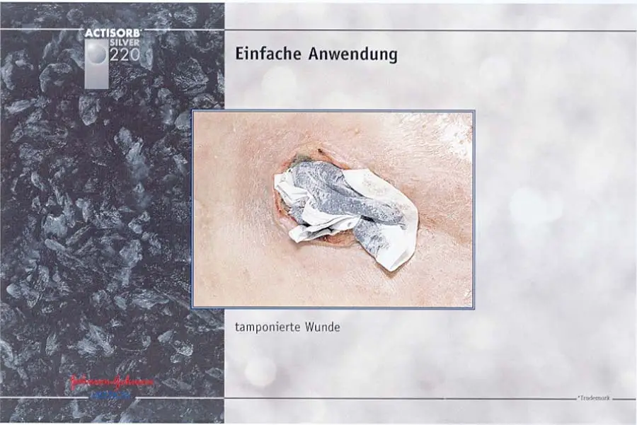 | ACTISORB Silver 220 kann beidseitig verwendet und tamponiert werden. Das Schutzvlies muss unbeschädigt bleiben und darf nicht geschnitten werden. Ansonsten besteht die Gefahr von ungiftigen Verfärbungen, weil schwarze Aktivkohlepartikel in der Wunde verbleiben könnten. zurück zum ersten Teil "Anwendung" nächste Seite zum Inhaltsverzeichnis ACTISORB Silver 220 | ![]() |