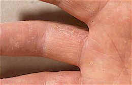 Eintrittspforte für allergene Substanzen. In den Fingerzwischenräumen ist die Haut