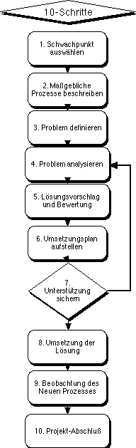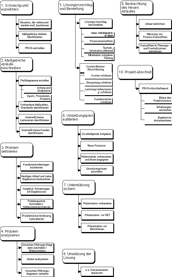Die Projektgruppenarbeit muß durch klare Arbeitsmittel und eine nachvollziehbare Struktur bestimmt sein. In den verschiedenen Stufen bestehen Aufgaben, die durch bestimmte Werkzeuge leichter zu lösen sind. Die Moderatoren sollten diese kennen und anwenden können. Die "10 Schritte" sind Gesetz für die Arbeit der PROGs (Klicken Sie auf die Grafik, sie wird dann "ausgefaltet") Beispiele