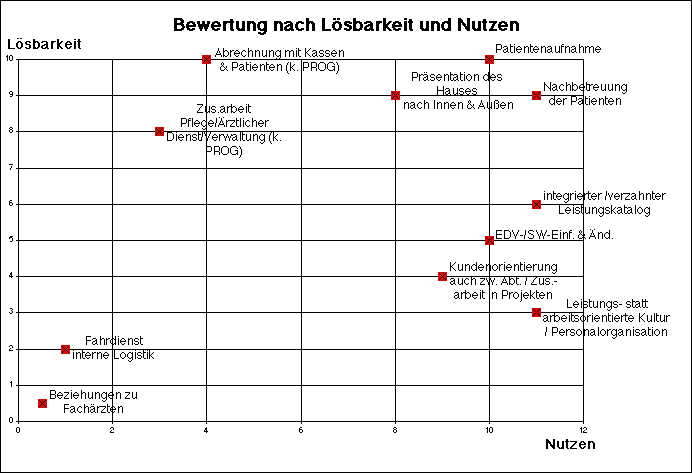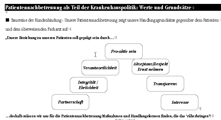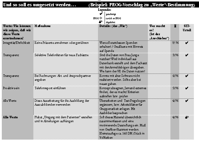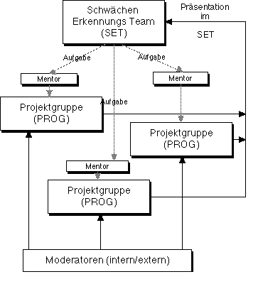 Das Schwächen- Erkennungsteam (SET) ist "Auftraggeber" für die einzelnen Projektgruppen (PROG`s). erkennt Schwachstellen und Problembereiche indem es einmal im Jahr eine Stärken-Schwächen-Analyse durchführt stellt einmal im Jahr auf Basis der bekannten Analyse (s. Bsp.) von Lösbarkeit und Nutzen einer Aufgabe einen Arbeitsplan auf. Mit Verteilung von Start, Präsentation und Follow-up für einzelne PROGs über das Jahr. stellt die PROGs zusammen gibt einen klaren Auftrag an das jeweilige PROG- Team nimmt den Vorschlag aus dem Team an und autorisiert damit die Umset zung (s. Bsp.) besteht aus 5-6 Mitgliedern Das SET kommt etwa zweimonatlich zusammen. Erkennen von Aufgaben für neue Teams Entgegennahmen von Präsentationen der PROGs. und Beschluß über Umsetzung legt einmal jährlich Rechenschaft über den Erfolg des Systems ab. Die Aufgaben des SET-Leiters Stellt einen Arbeits- und Terminplan für das Jahr auf. Gibt Kopie des Arbeitsplanes und aller SET-Beschlüsse an den QS-Koordinator Lädt mit Angabe einer Agenda (Was ist zu tun") zu den einzelnen SET-Terminen ein. Sorgt dafür, dass jedes PROG von einem Mentor aus dem SET begleitet wird Leitet die SET-Sitzungen Die Aufgaben des PROG-Mentors Der Mentor ist für das Follow-up in der Umsetzung zuständig und muss 3 Monate nach Ende des PROGs einen schriftlichen Status/Ergebnisbericht im SET abgeben. Bespricht die vom SET formulierte Aufgabe mit dem Moderator des PROG Ebnet "seinem" PROG den Weg, d.h.insbesondere: er hilft bei Blockaden weiter Eröffnet die erste PROG-Sitzung Findet einen Termin für die Präsentation der PROG-Vorschläge im SET Die Projektgruppen (PROG) sind das eigentliche Rückgrat der Ständigen Verbesserung. Arbeit mit internem Moderator nach dem 10-Schritte-Programm (das ist Gesetz) leistet die eigentliche Problemlösung recherchieren selbständig Hintergründe des Problems (IST-Aufnahme etc.) stellen einen Zeitplan auf, verteilen Aufgaben prüfen, ob sie zusätzliche Personen benötigen präsentieren ihren Vorschlag dem SET. setzen nach Genehmigung durch SET die Maßnahmen um geben dem Mentor Bericht über den Stand der Umsetzung . Die Arbeit im PROG