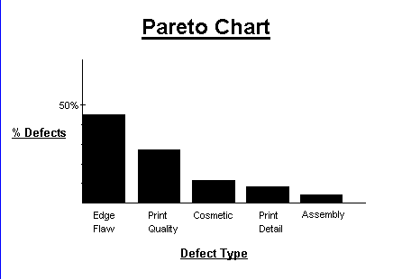 From the Pareto Chart it is possible to see that the initial focus in quality improvement should be on reducing edge flaws. Although the print quality is also of some concern, such defects are substantially less numerous than the edge flaws.