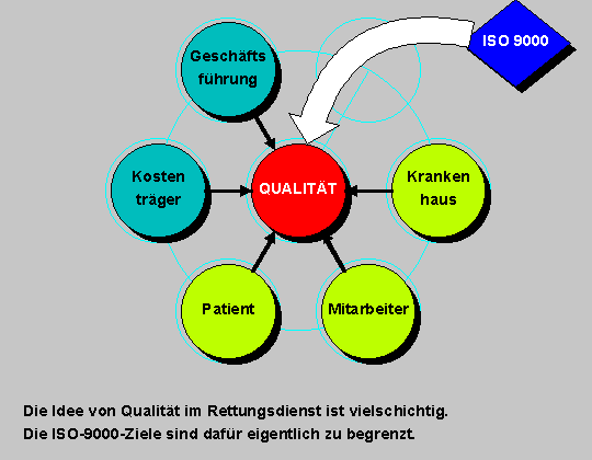 Einleitung: Qualität im Rettungsdienst, was könnte das sein?Erläuterungen zu Begriffen des Qualitätsmanagements finden Sie hier! In einem so elementaren Bereich des Gesundheitswesens ist Qualität eine unausgesprochene Selbstverständlichkeit. Ein flächendeckendes Netz von Fahrzeugen und Personal, was zu jeder Zeit und bei fast jeder Witterung innerhalb kürzester Zeit an jedem Einsatzort eintreffen kann. Ein einheitlicher Standard bei der Ausbildung des eingesetzten Personals und bei der technischen Ausrüstung der Fahrzeuge ergibt ein gut funktionierendes Glied innerhalb der Rettungskette. Kein Zweifel, die gesetzlichen Rahmenbedingungen für das deutsche Rettungswesen ermöglichen die Entstehung einer hohen Versorgungsqualität. Die globale Perspektive gibt keinen Anlaß zur Kritik.