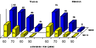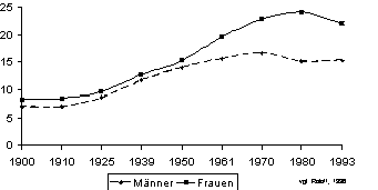 Abb. 2: Lebenserwartung - Von 100 der Neugeborenen erreichten ein Alter von 60, 70, 80 oder 90 Jahren Eine weitere wichtige Einflussgrösse für den Bestand einer Bevölkerung sind Zu- und Abwanderungen. Welche Rolle spielt Migration als weltumspannendes Phänomen (vgl. [8])? Wie wird das Wanderungsgeschehen die Bevölkerungsstruktur in Deutschland beeinflussen? So wurde z.B. für 1994 in Deutschland ein positiver Wanderungssaldo von 329.500 Personen ermittelt. Die Frage, ob die Finanzierungs- und Strukturprobleme der Sozialversicherungen durch Zuwanderungen "gelöst", d.h. abgemildert werden könnten, wird in verschiedenen Szenarien diskutiert. So kann Zuwanderung begrenzt dazu beitragen, fehlende Geburten zu "ersetzen", wobei dies zur Folge hätte, dass eine gezielte Einwanderungspolitik erfolgen müsste. Entscheidend ist nämlich nicht die Zahl der Zuwanderer, sondern deren Alterszusammensetzung (vgl. [1]). 3. Lebenserwartung Das demographische Altern der Bevölkerung ist wie schon erwähnt von Fertilitäts- und Mortalitätsvariationen abhängig. Im OECD-Bereich sank die Nettoreproduktionsrate in den letzten Jahrzehnten, während gleichzeitig die Lebenserwartung anstieg. Dies wird auch als "double aging" bezeichnet. In Abb. 2 zeigt sich der deutliche Anstieg der Lebenserwartung in Deutschland in diesem Jahrhundert (vgl. [4]). 4. Mortalität Sollen Aussagen über die Entwicklung der Sterblichkeit in Deutschland gemacht werden, so muss die unterschiedliche Entwicklung in der DDR und in der Bundesrepublik seit Mitte der 80iger Jahre festgehalten werden. Diese wird aber erst dann deutlich, wenn standardisierte Sterbeziffern zu Grunde gelegt werden, da die ungünstigere Entwicklung in der ehemaligen DDR durch den relativ günstigeren Altersaufbau nivelliert wurde. Für das Jahr 1993 liegt die standardisierte Sterbeziffer im früheren Bundesgebiet bei 7.4 (rohe Sterbeziffer: 10.9), in der ehemaligen DDR bei 9.0 (rohe Sterbeziffer: 11.9). Die z.Zt. positive Veränderung der Sterblichkeit in Deutschland wird durch die Alterung in der Bevölkerung gebremst. Entscheidende Verbesserungen beim Rückgang der altersspezifischen Sterblichkeit im gesamten Bundesgebiet können nur für den Bereich der Säuglings, Kinder und Jugendsterblichkeit festgestellt werden. 5. Morbidität Die "Entwicklung" von Krankheiten über die Zeit hinweg ist nicht einfach nachzuvollziehen. Unproblematisch scheinen die sogenannten meldepflichtigen Krankheiten, deren Auftreten über die Jahre in der amtlichen Statistik dokumentiert ist. Schon die Todesursachenstatistik wird stark bezweifelt (vgl. z.B. [2]). So dienen vielfach die Ergebnisse der Krankheitsartenstatistiken (AU-Tage nach ICD) der Krankenkassen, die Rentenzugangsstatistiken des VDR (Erwerbsunfähigkeitsrenten nach ICD) und die Krankenhausstatistiken als Indikatoren für das Morbiditätsgeschehen. Bis zur Veröffentlichung der neuesten Mikrozensusdaten (werden bis Dezember vorliegen) dienen die vom Robert-Koch-Institut [3] veröffentlichten Survey-Daten, die auf Selbstangaben (subjektive Morbidität) beruhen, als gute Kenngrössen für den Gesundheitszustand in Ost und West. Die Prävalenzrate für Herzinfarkt lag für westdeutsche Männer (2569 Jahre) bei 4.2% (Ost: 2.1%), für die Frauen bei 1.6% (Ost: 0.3%). Als Prävalenz für Schlaganfall ergab sich für die Männer im Westen ein Wert von 1.5 % (Männer Ost und Frauen unter 1%). Hier ist von einer Untererfassung auszugehen, da mit zunehmenden Alter ein Morbiditätsanstieg erfolgt. Für Diabetes mellitus wurde für Männer (West) bzw. Frauen (West) eine Prävalenz von 5.5% (Ost: 4.4%) bzw. von 4.3% (Ost: 5.8%) ermittelt. Mit der Alterung der Bevölkerung wird sich das Krankheitsspektrum verschieben, d.h. Krankheiten, die bisher nicht ("mehr") oder seltener auftreten, werden an Bedeutung zunehmen. Mit einem systematischen Anstieg der Prävalenz kann z.B. bei degenerativen Gelenkerkrankungen, Venenerkrankungen, Diabetes mell. Typ II, Depression, Seh- und Hörstörungen, Demenz und Pflegebedürftigkeit gerechnet werden. Diese Entwicklung ist für die Versorgungssysteme bedeutungsvoll. Ausblick Versucht man in Abhängigkeit von den Wanderungsgewinnen die Bevölkerungsentwicklung für Deutschland etwa bis zum Jahr 2040 (vgl. [7]) vorauszuberechnen, so werden bei einem angenommenen Bevölkerungsrückgang, der bis zum Jahr 2030 nicht die Bevölkerung im Rentenalter betrifft, 32 von 100 Männern und 38 von 100 Frauen 60 Jahre oder älter sein. Für Europa wird ein Ansteigen des Anteils über 60jährigen um 10%Punkte von 18,1% auf 28, 1% vorhergesagt. Die gesundheits- und gesellschaftspolitischen Aspekte einer solchen Entwicklung müssen vor dem Hintergrund folgender Tatsachen diskutiert werden: 1) Alterung einer Bevölkerung bedeutet nicht automatisch einen Anstieg der Inanspruchnahme medizinischer Leistungen und daß Sozialsysteme nicht mehr finanzierbar werden. Neueren Forschungen zufolge sind Ausgabensteigerungen im Gesundheitssystem mit demographischen Entwicklungen nicht zu erklären. 2) Andererseits kann mit einem Anstieg der Lebenserwartung, möglicherweise durch technischen Fortschritt gewonnene Lebensjahre, nicht von einer "disability- free life expectancy" ausgegangen werden. Ob das in den zusätzlichen Lebensjahren häufigere Auftreten von Krankheiten altersbedingt ist oder einen allgemeinen Trend widerspiegelt, ist zur Zeit Gegenstand demographischer und sozialepidemiologischer Diskussionen. Literatur [1] Dinkel RH, Lehbock U: Könnten durch